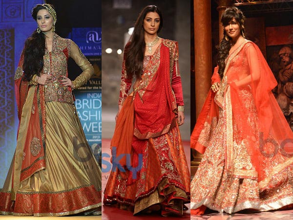 Esha Gupta also wore a flame coloured orange lehenga at the IBFW 2013 recently. The lehenga had a very broad golden border, the choli was completely embroidered and the dupatta was plain except for tiny golden sequins.