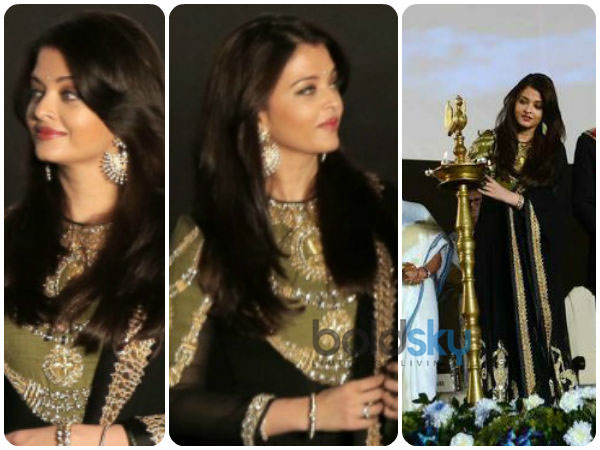 Aishwarya Rai was spotted at the opening ceremony of the Kolkata International Film Festival 2014. Looking splendid in a rich black and gold Sabyasachi anarkali, this beauty got our attention instantly.