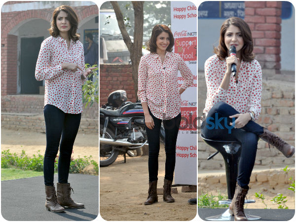 At the 'Support My School' campaign, Anushka Sharma made her presence felt in a beautiful way. The sassy actress was seen wearing a heart printed shirt with a pair of tight jeans. What we loved the most about this look is her confidence in carrying out this style.