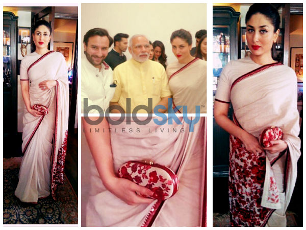 Kareena Kapoor looked wonderful in a cream & red Sabyasachi saree from the Indian couture week 2014 collection. Not wearing too much of accessories, she carried a red clutch by the same designer. A red bright pout and a gel bun hairstyle finished off her look at the HN Reliance Foundation Hospital Launch. Husband Saif Ali Khan looked dashing in a white kurta pyjama with a striking red piping collar!