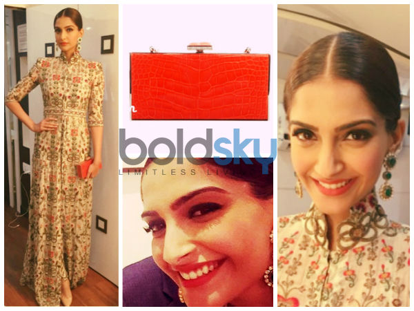 The other stylish queen at the HN Reliance Foundation Hospital Launch was Sonam Kapoor. Wearing an ensemble by designer Anamika Khanna she looked elegant. The embroidered long kurta was paired up with a red Judith Leiber clutch and diamond - emerald earrings.