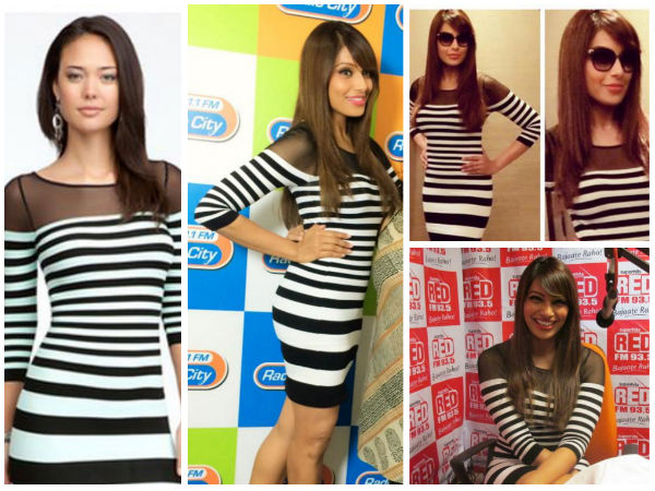 Bollywood actress Bipasha Basu was spotted at the Radio City Studios. Wearing a seductive dress from designer Bebe, this beauty was on fire. The striped short dress on Bips gave out an effect which was way too much to handle.