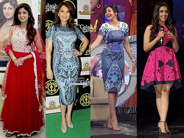 Madhuri Dixit wore this powder blue piano print knee length body con dress while promoting her movie. She looked classy in this Pankaj & Nidhi creations.