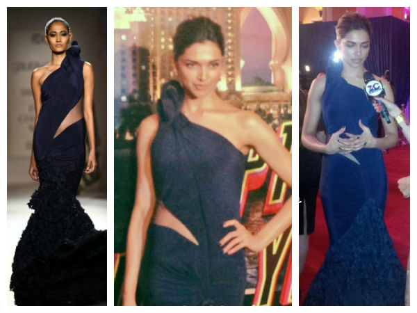 Let's begin with Deepika Padukone. Deepika at the Happy New Year premiere wore a lovely Gaurav Gupta gown. She looked marvellous in the dress, probably saving the best of her attires for the grand premiere. Deepika in the blue coloured Gaurav Gupta Gown finished off her look with simple Dior earrings. She certainly did allow her Gaurav Gupta gown do all the talking, didn't she?
