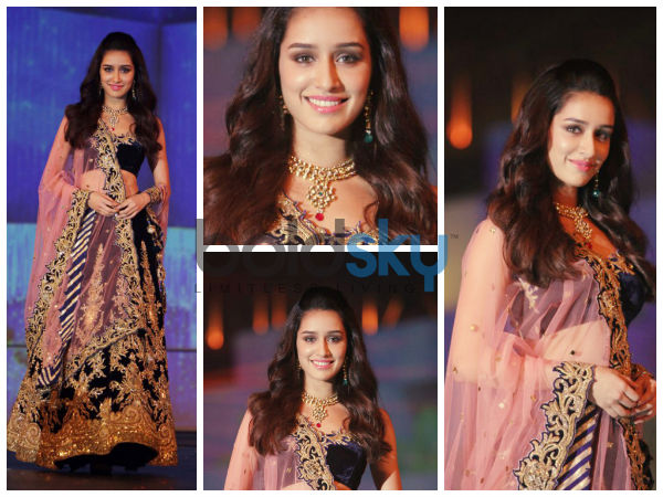 Shraddha Kapoor walked the ramp in a heavy Archana Kochhar lehenga at the Bullion Summit Fashion Show. Wearing a navy blue, bridal lehenga with gold detailing, Shraddha impressed the audience. This 'Haider' beauty completed her bridal style with a beehive fringe and shimmering lips. Metallic accessories adorned her neck and ears.