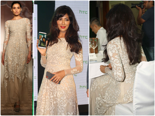 Chitrangada Singh was seen in a Varun Bahl gown recently at the launch of a mobile phone in Delhi. She looked quite elegant in this white lace gown. The full sleeved maxi gown had sheer sleeves and intricate lace work on it. The embroidery was floral in motifs and Chitrangada managed to carry the look rather well.