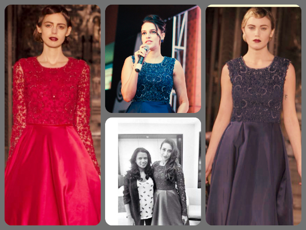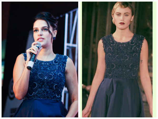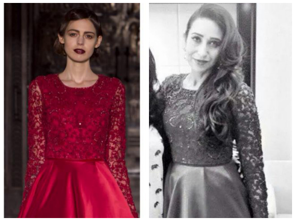It is all about looking your best when celebs copy the same outfit. Beauties Karisma Kapoor and Neha Dhupia wore the same Hema Kaul gown at two events recently. Designer Hema Kaul showcased this dress in two different shades at a fashion show. The two colours were navy blue with a vibrant tinge and blood red that was rather appealing to the eyes.