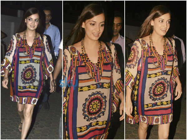 Dia Mirza was spotted in Mumbai looking beautiful as ever. Wearing a colourful kaftan with a pair of sandals this beauty was a sight not to miss. When we last saw Dia Mirza she was seen in another short dress. Printed dresses are in fashion and Dia Mirza knows how to get your attention. Flaunting her figure to the maximum, Dia Mirza wore a confident smile and attitude.