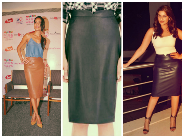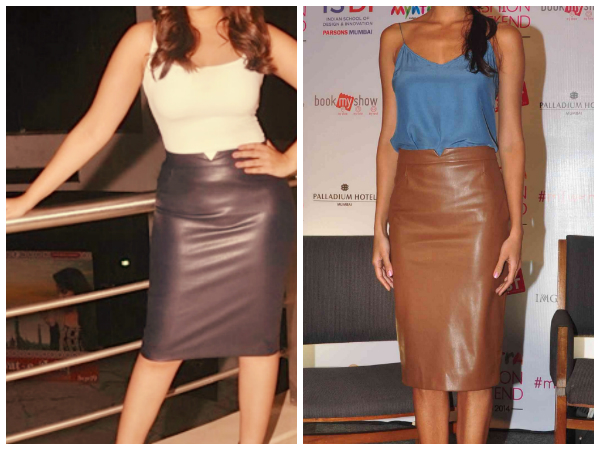 Bollywood beauties love copying each other when it comes to fashion. Parineeti Chopra was spotted in a Zara tight fit, leather skirt at one of her movie promotions recently. The same dress was seen on Lisa Haydon at the Myntra event recently. The only difference was the colour of the skirts!