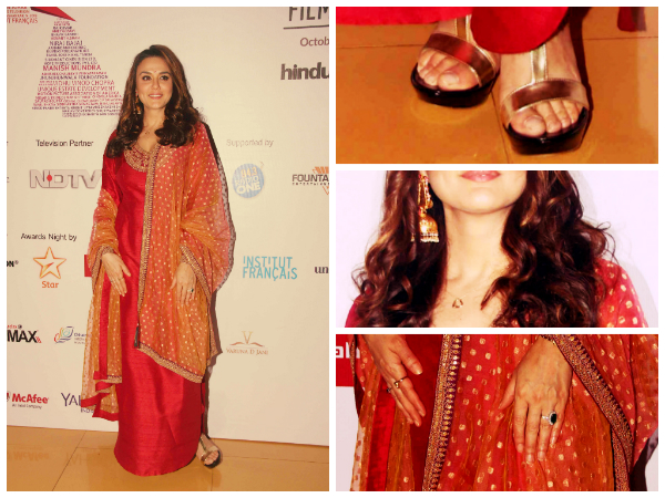 Golden strappy sandals, simple gold finger rings and long jhumkas were the only accessories Preity Zinta wore with the Sabyasachi kurta. All in all Preity Zinta looked ravishing and red hot while walking the red carpet at the Mumbai Film Festival 2014.
