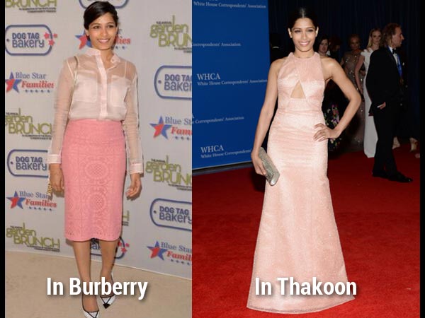 Now, we have often seen this beauty in designer wear by Dior, Pankaj and Nidhi and Anamika Khanna. But, of late, Freida Pinto is seen in a lot of foreign brands like Burberry and Oliver Tolentino. At the White House Correspondents Dinner 2014, Freida Pinto stunned the crowd with her revealing dress by designer Thakoon. Earlier at the Annual Garden brunch, Freida Pinto was seen in another pale number by Burberry.