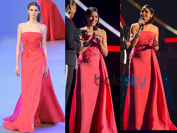 Freida Pinto's Elie Saab gown was beautiful. The peach warm colour itself was heart-breaking and she made sure to complement it well with the right accessories. The bodice of her strapless gown was heavily embellished with detailing. The delicate sparkles on the bodice of her gown made Freida gleam right through the event. On the other hand, the Elie Saab strapless gown on Freida also featured a thigh high slit. When she went on stage, she flaunted her thighs to extremes which again was another highlight at the Peace Concert 2014 event.