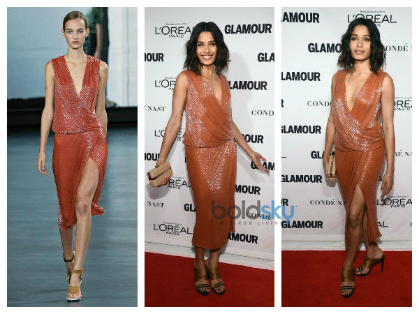 At the Glamour 2014 Women Of The Year Awards there were many celebrities who soaked the red carpet, but none could beat the sassy Freida Pinto. As this beauty glided on the red carpet, there were many eyes on her. Looking lovely in a soft colour, Freida was a touch of electricity!