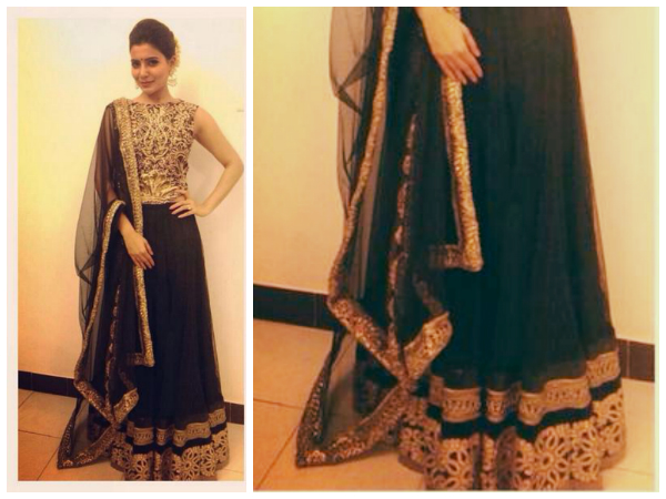 The golden beauty Samantha Ruth Prabhu looked stunning at the audio launch of her movie ‘Kaththi'. She was wearing a heavy lehenga by designer Siddartha Tytler. The black and golden lehenga was gaudy and appealing as well.