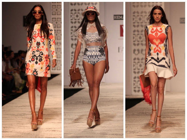 The Hemant & Nandita show at WIFW 2015 Spring And Summer Collection saw unique designs going on display one after another. The patterns were the highlight of the day with brilliant colours illuminating the ramp. The designs included frill skirts, crop tops, flounces and a whole range of other design styles. These dresses were couples with lovely slits and silhouettes.