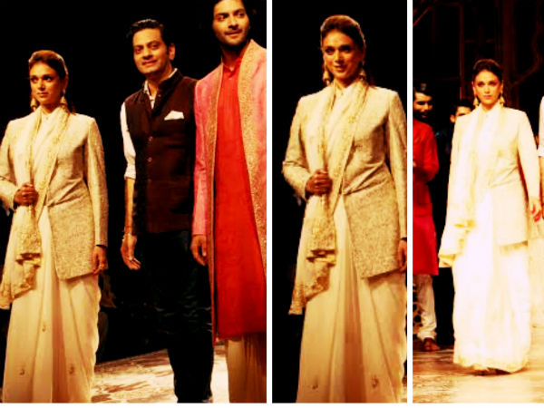 On the runaway of IBFW 2014, Aditi Rao Hydari was seen in a white saree with exquisite zardosi work. The shimmering white saree had details created out of organza and sequins. The zari work on the sare was silver matching the white colour of the saree. Aditi teamed up the saree with a full-sleeved brocade jacket.