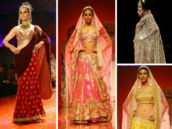 What struck us as novel about this collection is the fact that even as a bride a woman should not be scared to show off her sensuality. The designs in Suneet Varma's IBFW 2014 collection were bold and revealing. The fit and flare lehengas and lehenga sarees were paired with deep cut cholis. The cutout cholis and bustier blouses made the brides ooze sexuality. This line of outfits was inspired by the Jaipur bridal tradition.