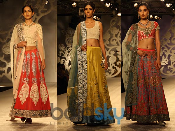 We saw delicate hemlines from Varun Bahl's couture. There were a number of garments that were shaded or dual coloured. The use of bright pink to shade the white sarees and lehengas was particularly noticeable. We saw a number mustard coloured outfits in this collection the inspiration for which comes from Indian folk art. Dipped hemlines and floral embroidery were also noticeable elements in this collection.