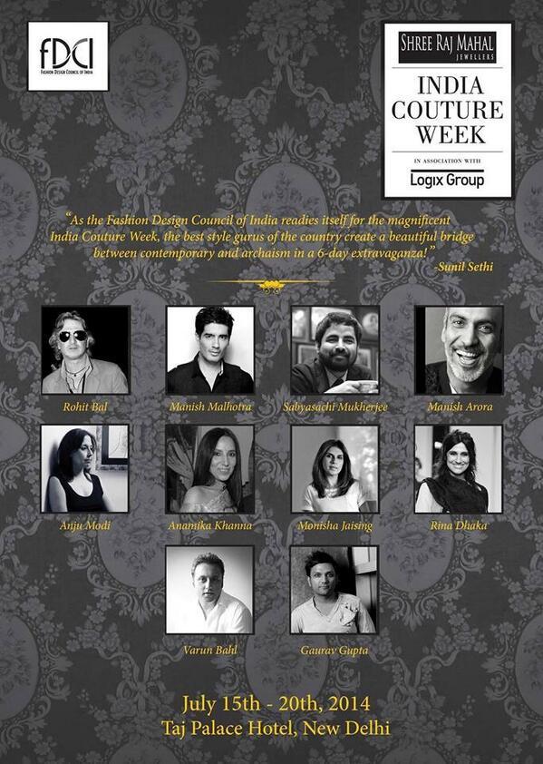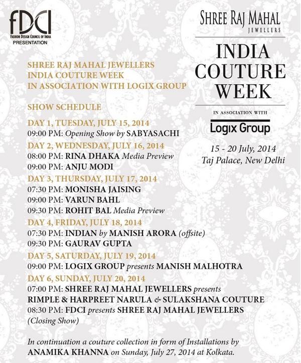 The Fashion Design Council of India (FDCI) has announced the show schedule for the upcoming Shree Raj Mahal Jewellers India Couture Week 2014 in association with Logix Group which has an impressive lineup of participating designers.