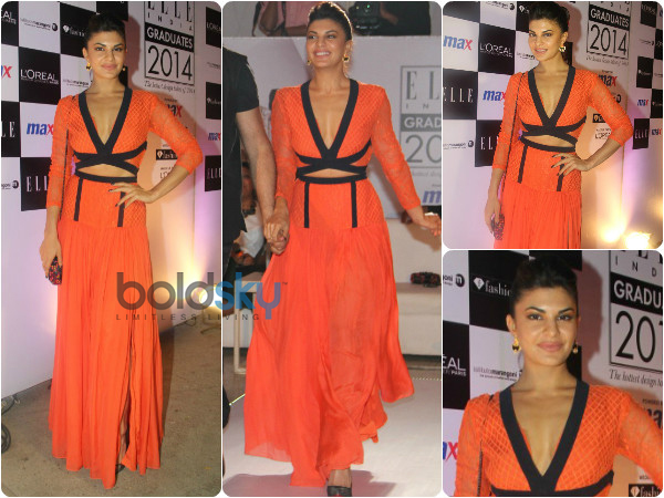 Jacqueline Fernandez's favourite colour shade is orange. In most of her recent appearances, we have seen Jacqueline wearing some shade of this bright colour. The colour on this beauty makes her look stunning and cute. What is more interesting about Jacqueline Fernandez's gown is the thigh high slit pattern on the maxi at the side. Jacqueline who attended the Elle India Graduates 2014 event grabbed a lot of solid attention. Her smile and figure made eyes go pop.