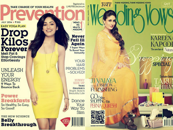 Kareena Kapoor who is on Wedding Vows magazine cover for July 2014 looks like a newly blushing bride. The colour makes her look fresh and gorgeous. On the other hand, Yami Gautam, who sports a more causal look for Prevention magazine cover, makes one want to start living healthy. The colour yellow has been made to look very different on these two Bollywood beauties for the magazine photoshoot.