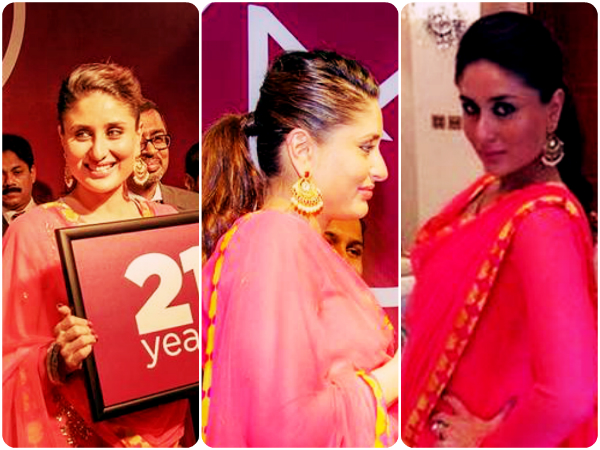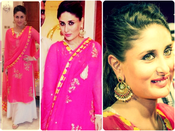The palazzo pants had a very wide hemline and were white in colour. Bebo also carried a drape that was pink and yellow in colour. Kareena Kapoor looks hot in pink. And this shade of brilliant bright pink actually fired her complexion even more. She wore chand balis in her ears and carried the drape folded over her chest.