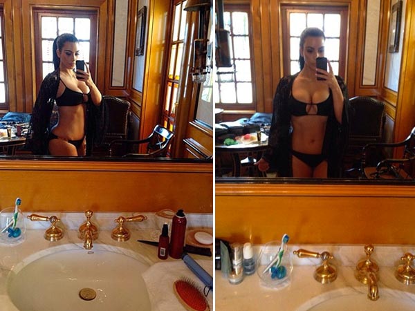 Kim surprised her fans and followers by posting some sexy and bold selfies on Instagram. Kim Kardashian wore a barely there black bikini of 16-year-old sister, Kylie Jenner. Kim swiped the black teeny bikini of her little sister Kylie and clicked down some sexy selfies in the bathroom. Kim captioned the selfies saying, "Yep stole Kylie's bikini...she's not getting it back."