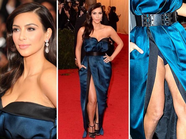 Kardashian's leg-baring Lanvin navy blue gown looked different though on the red carpet at the Met Gala 2014. On the red carpet the beautiful mummy carried a more classy look. Her navy blue thigh high slit dress had a thick black belt which clinched her tiny waist and her brunette locks were swept to one side. She finished the timely look with diamond drop earrings by jewelry designer Lorraine Schwartz and rocked black cage sandals by Lanvin.