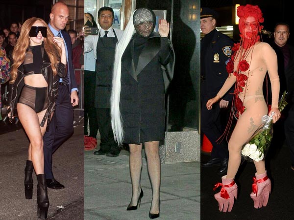 The third weird garment Lady Gaga has worn in the recent past just after she close a year older is another see through and revealing hot-pants , crop top and fishnets. To hide her modesty, the singer had a strip of black fabric right in the middle of the see through hot pants. To compelte the look, Lady Gaga sported towering platform boots, a brown curled wig and huge black tinted sunglasses.
