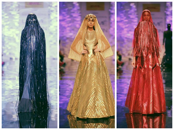 Could you ever imagine that a fashion show would feature a burkha. This fringe burkha and many more like it in Amit Aggarwal's collection reminded us of Star Wars!