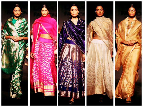 Conversely, the plain Chanderi sarees and lehengas were teamed up with brocade blouses and drapes. The balance used in this collection is just impeccable. Sanjay Garg's LFW 2014 collection one of the best examples of solid colours. Every single outfit in this collection was created out of only one colour and accentuated with golden zari work. There was no hit of colour blocking or use of dual colours. The technique used for developing these garments is ‘kadwa' brocade used in Benaras.