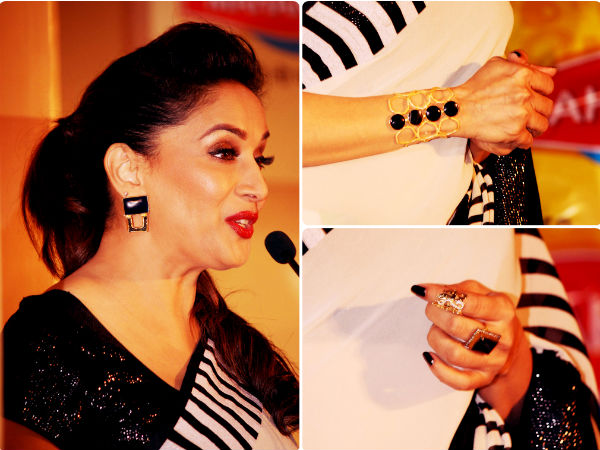 What we actually love about this look are Madhuri's accessories. She wore chic jewellery with black stones encrusted in gold. The angular earrings, the perforated cuff bracelet and the cocktail ring together give her a very suave look. The red lips looked very vibrant on the 'Dhak-Dhak' girl and we love the new hair do.