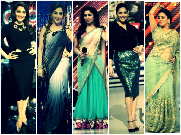 This season, Madhuri Dixit's style statement in Jhalak Dikhhla Jaa was pretty blow hot and cold. At best, we could say that she did not make any fashion mistakes. However, when it comes to the diva, our expectations are sky high. That is why; we found Madhuri Dixit's saree, lehengas and skirts slightly less impressive than usual.