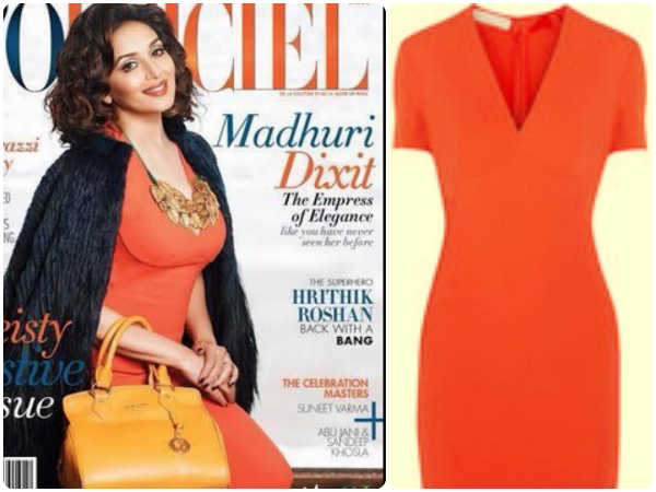 Madhuri Dixit is on the cover of L'Officiel this month. The cover girl is dressed in an orange number with a fur cape over it. Madhuri Dixit is in a Stella McCartney dress on the cover of L'Officiel.