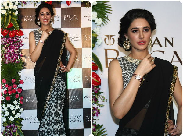 The sari wasn't all that was amusing.The earrings were another standout feature. Nargis Fakhri at the Titan Launch event sported brilliant chaand bali earrings. She decided to keep her hair updo to consummate the traditional element.