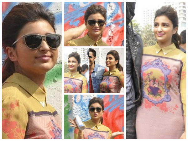 At the Kill Dil promotions, Parineeti decided to put on a collared dress from Nida Mahmood. She hasn't been seen with a collared dress too many times before and we must say that the dress did look lovely on her. The dress was unique in its style and designing. It had some lovely detailing which we will be looking into a little deeper over the course of the article. There were other aspects to Parinneti Chopra in Nida Mahmood as well.