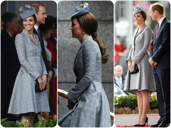 On the other hand, Kate's tartan dress by Alexander McQueen was elegant to look at. Her knee length, teal blue shade dress was pleasing to the eyes and looked perfect on the second time pregnant Kate Middleton. She wore this pastel dress with a Jane Taylor hat, Jenny Packham clutch, Annoushka pearl earrings and ebony Prada pumps.