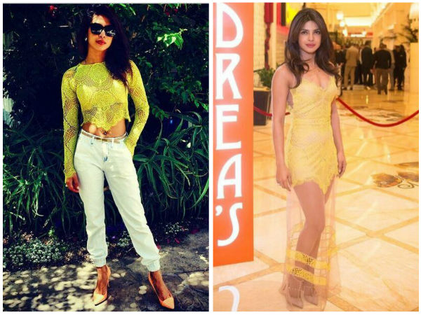 As mentioned earlier, we also saw the talented Priyanka Chopra at a night club along with Hollywood singer, Britney Spears having the time of her life. Here again, the beauty was wearing a designer sheer bottom and lace lemon dress by For Love and Lemons. Last but not the least, one of the uncanny things we noticed about the actresses style at the club and the promotions is her love for the pink pointed pumps, we spotted her wearing on both occasions.