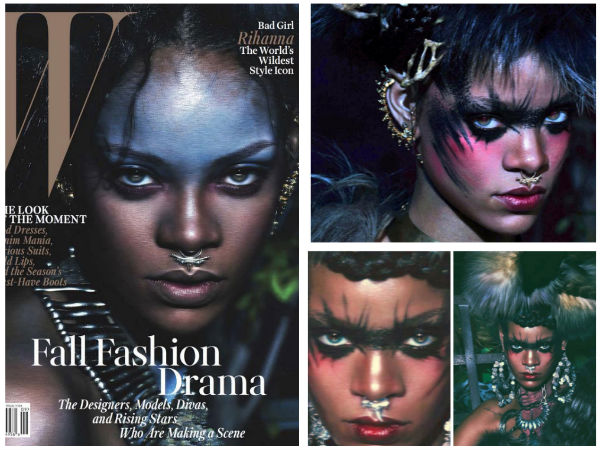 On the cover of W magazine, Rihanna also gives us an arrange of looks. The makeup she wears for each one of her shoots is different and colourful. As we know, this beauty loves to play with varied colours. However, this is not the first magazine cover of Rihanna's. For the month of May 2014, we also saw her on the cover of Vogue looking sexy and seductive in the nude. This time, she decided to wrap it up with fur and all sorts of tribal accessories.