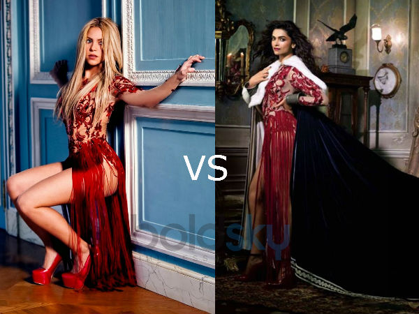 Both Shakira and Deepika Padukone looked sultry in the red frilly Julien Macdonald bodysuit. While one wore in the video, the other flaunted her toned long legs for the magazine's photoshoot. We are so overwhelmed with the mind blowing duo video of Rihanna and Shakira, that we think Shakira wore the frilly bodysuit to perfection and used the frills to the fullest as well!