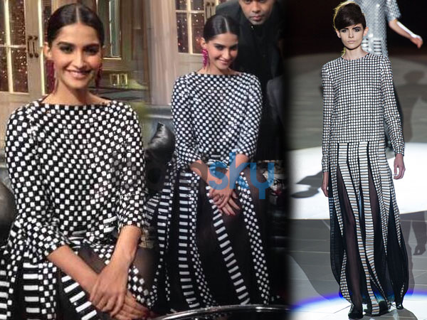 Sonam Kapoor was wearing a Marc Jacobs number on the sets of Koffee With Karan. As expected, Sonam Kapoor looked gorgeous and splendid in a monochrome printed Marc Jacobs gown. Sonam wore the checkered/striped gown with utmost style and glamour.