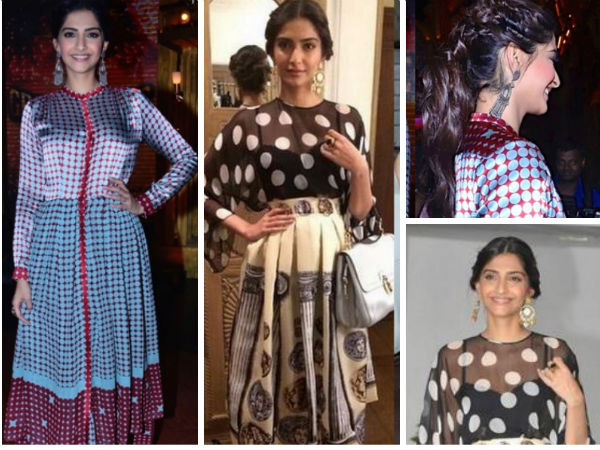 The other dress we saw Sonam Kapoor in was a Dolce and Gabbana. She wore separates from D&G to Karan Johar's party. Sonam Kapoor was in Dolce & Gabbana polka dotted black top and cream coloured printed midi skirt. She wore the top tucked in and did her hair up into a low bun. She carried a white coloured tote and nude coloured peep toes. She looked nice but the glamour element was missing in this look.