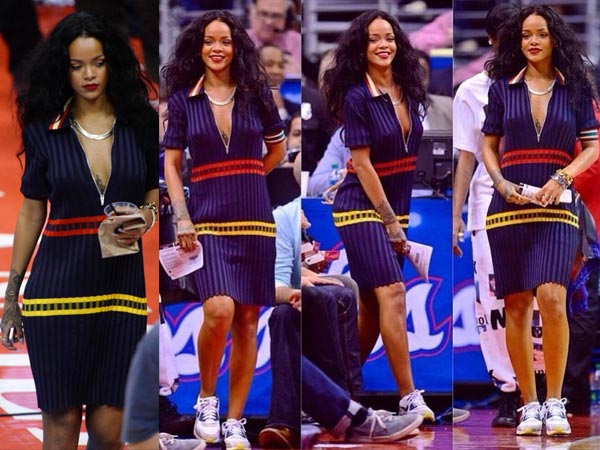 Rihanna made the casual sporty dress look stylish by adding the zipper on the bodice. She even carried the look by opening the silver zipper of the dress to flaunt her cleavage. The plunging neckline effect that the zipper gave also flashed her chest tattoo. She completed the look with white Nike sneakers.