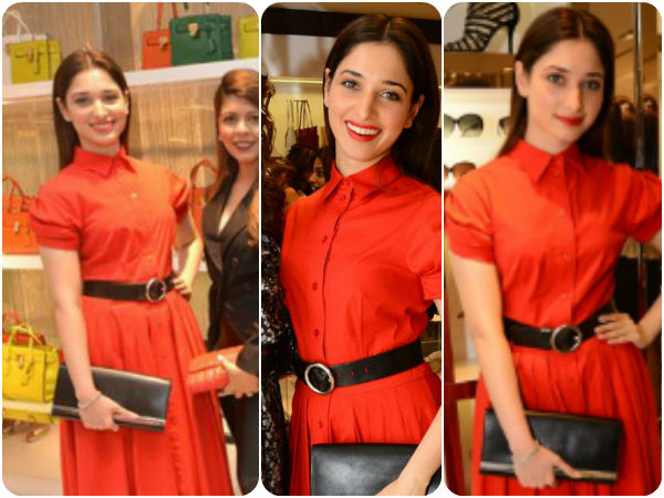 More importantly, Tamannaah Bhatia's look was so bright that we couldn't recognise the other divas present at the event. Looking stylish and red hot, Tamannaah was the centre of attraction at the event. The red pleated Michael Kors shirt dress on the starlet enhanced her beauty. The bright red also complemented her skin tone and added glamour to the ambience too.