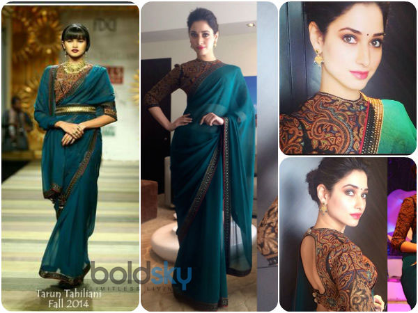 The choli of Tamannaah's teal Tarun Tahiliani saree is intensifying. Heavily printed with various coloured threads and a touch of zardosi, Tamannaah ignited a spark in the audience. Even the cut-out pattern at the back of her choli was 'wow'! On the other hand, we closely observed that the Chinese collared choli of Tarun's saree matched perfectly with the border of the saree. Thus, it added more spark to her traditional look.