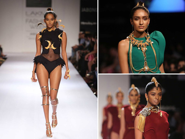 Truly inspired from the Greek architecture, this collection was admirable. The models who walked the ramp in style patterned a live column on stage which resembled the actual Greek columns. The heavy long necklaces on the beauties were ravishing.