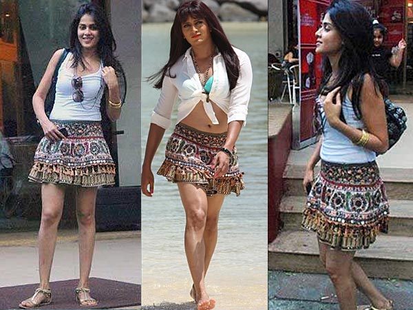 The Nishka Lulla skirt worn by Genelia on her date with Ritesh in 2011 was the ditto skirt seen on her husband in the movie, Humshakals. Now, this makes us confused to decide on who looks better in the Nishka Lulla skirt. The short skirt worn by Genelia looks perfect, where she is showing off her toned and sexy legs. The white crop top she paired with the short patterned skirt was apt as it brought out a whole new causal look for a date.