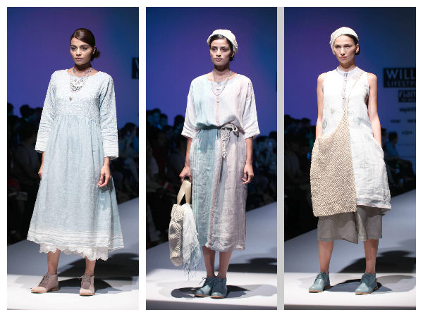 The prints used in the WIFW 2015 collection of EKA were simple and discreet. Most of the designs had no prints at all. They were plain cotton and looked totally comfy for the hot summer months. Layered tunic comprised a majority of the collection. The outfits were shirt dresses or shift dresses and we even saw a wrap around dress in the collection.