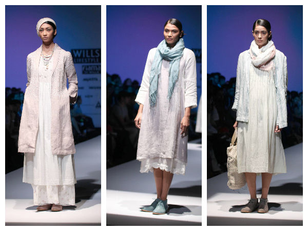 The blush tones we saw on the runaway are perfect for day wear. Coupled with interesting scarves and headgears, this collection is completely 'summer-ready'. Besides, the use of tribal jewellery and comfy sports shoes adds a touch of funkiness to the collection. This is simply cotton at its best.