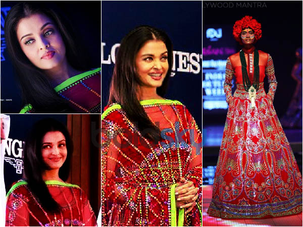 Aishwarya Rai wore the red Indian wear along with a sheer red dupatta. Due to the images we aren't sure if she wore it just the same as the original. If you take a close look at the original featured at the Indian Couture Week, you will see the design is pretty whacky and colourful.